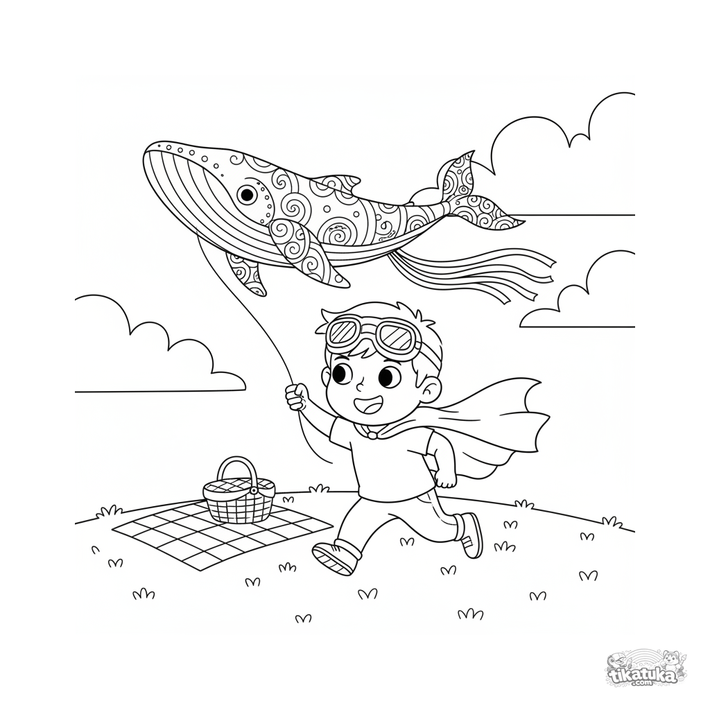 Página para colorir para meninos: uma criança de capa solta uma pipa em forma de baleia. Para 3-6 anos. Cena dinâmica com piquenique.