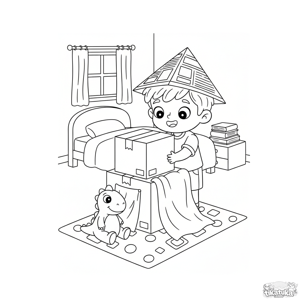 Página para colorir de um menino construindo um forte imaginativo com caixas de papelão no seu quarto. Para meninos de 4 a 6 anos.
