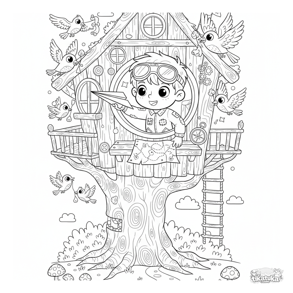 Página para colorir de um menino lançando um avião de papel de uma casa na árvore. Para crianças de 6 a 9 anos. Inclui óculos de aviador, mapa e bússola.