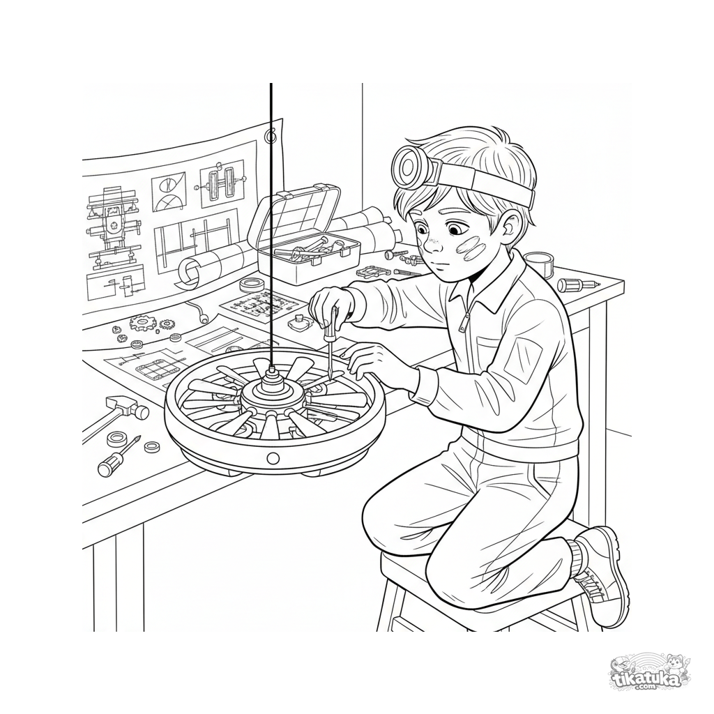 Página detalhada para colorir para meninos 10-12: um jovem inventor conserta um drone voador em um laboratório secreto, cercado por ferramentas e diagramas.