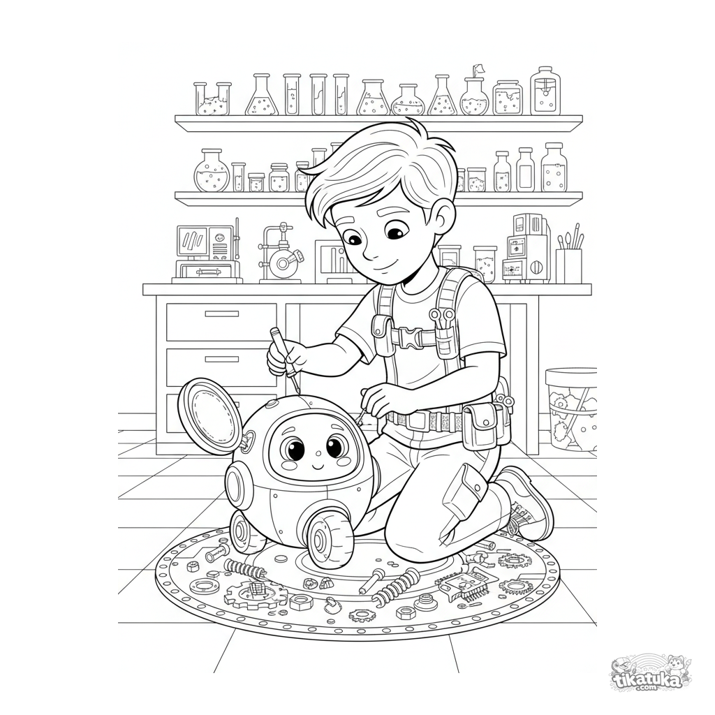 Página para colorir detalhada para crianças de 10-12 anos: um jovem engenheiro em um laboratório secreto conserta seu assistente robô.