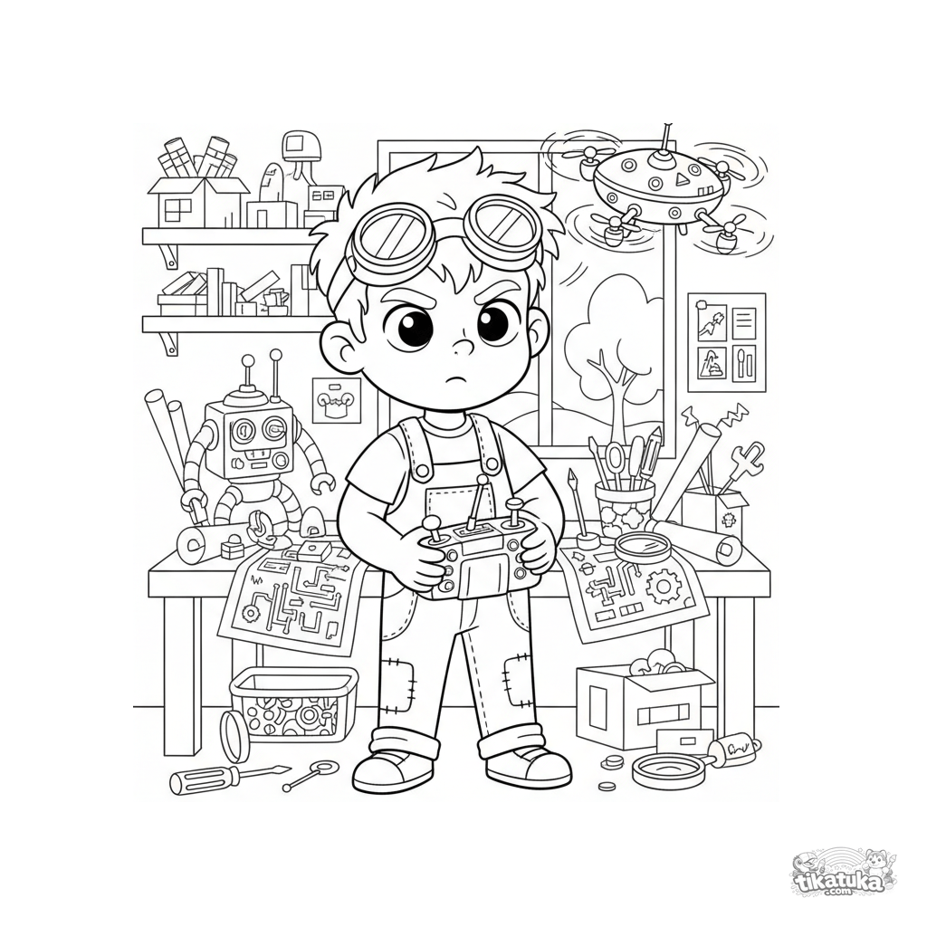 Página para colorir para meninos de 7-12 anos: um jovem inventor com óculos testa o controle de seu disco voador caseiro em uma oficina bagunçada. Muitos detalhes para colorir.