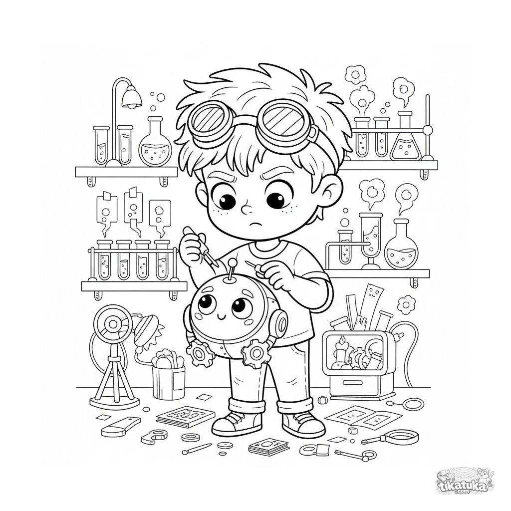 Página para colorir para crianças de 4-6 anos: um menino inventor e seu robô animal de estimação de engrenagem em um laboratório secreto.