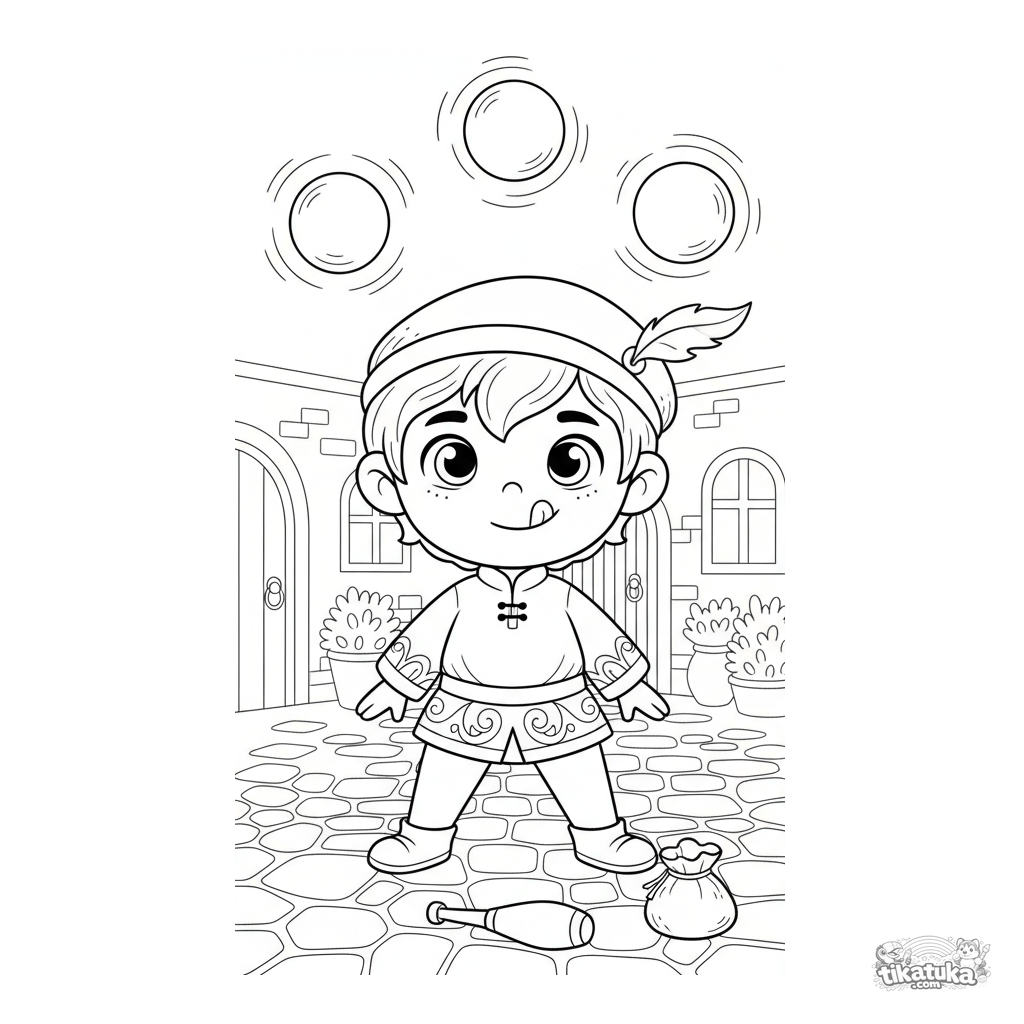 Página para colorir difícil para meninos de 8-12 anos. Um menino malabarista pratica com orbes brilhantes em um pátio de pedra ao anoitecer.