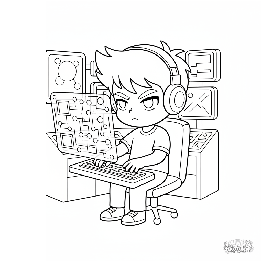 Página para colorir para crianças de 7-9 anos: um menino programador trabalha com uma interface holográfica em um laboratório secreto.