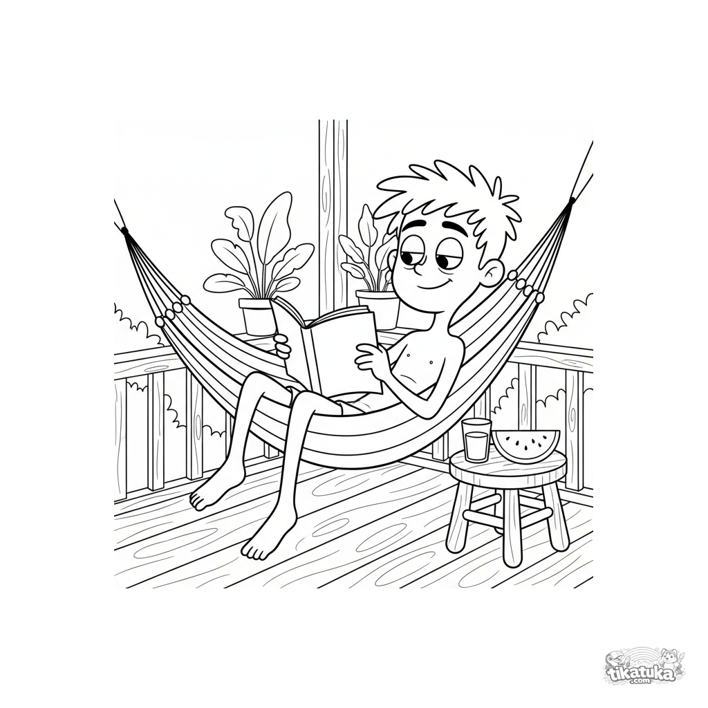 Página para colorir para crianças 7-9: um menino lê quadrinhos enquanto descansa em uma rede em uma varanda de verão.