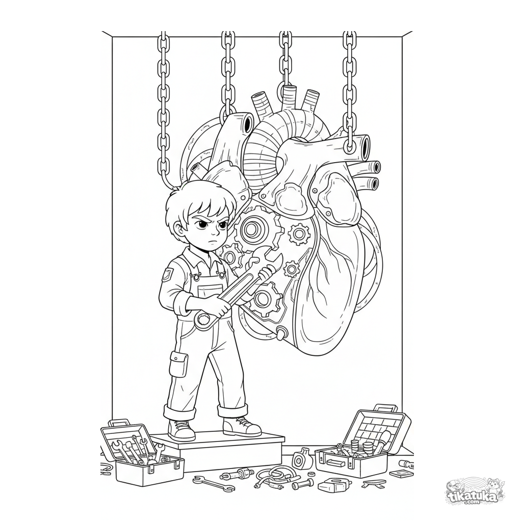 Página para colorir detalhada para crianças 10-12: um menino engenheiro em um laboratório secreto conserta um coração mecânico gigante com engrenagens.