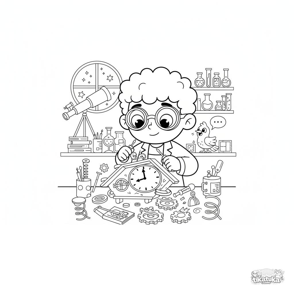 Página para colorir para crianças de 7-9 anos: um menino com óculos de aumento conserta um relógio de cuco falante em um laboratório secreto. Estilo de ilustração de livro.