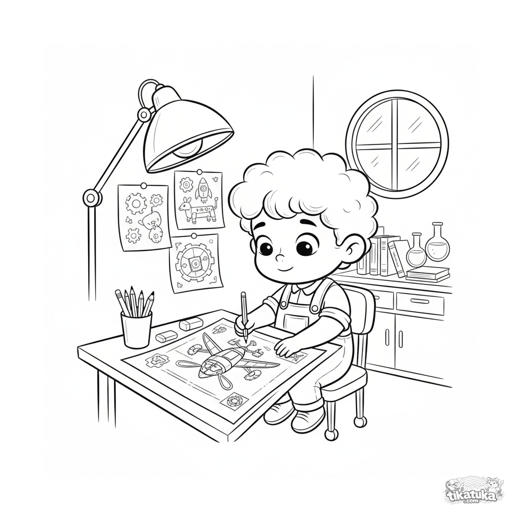 Página para colorir para crianças de 7-9 anos: um menino em um laboratório em uma mesa de desenho, absorto desenhando uma planta detalhada.