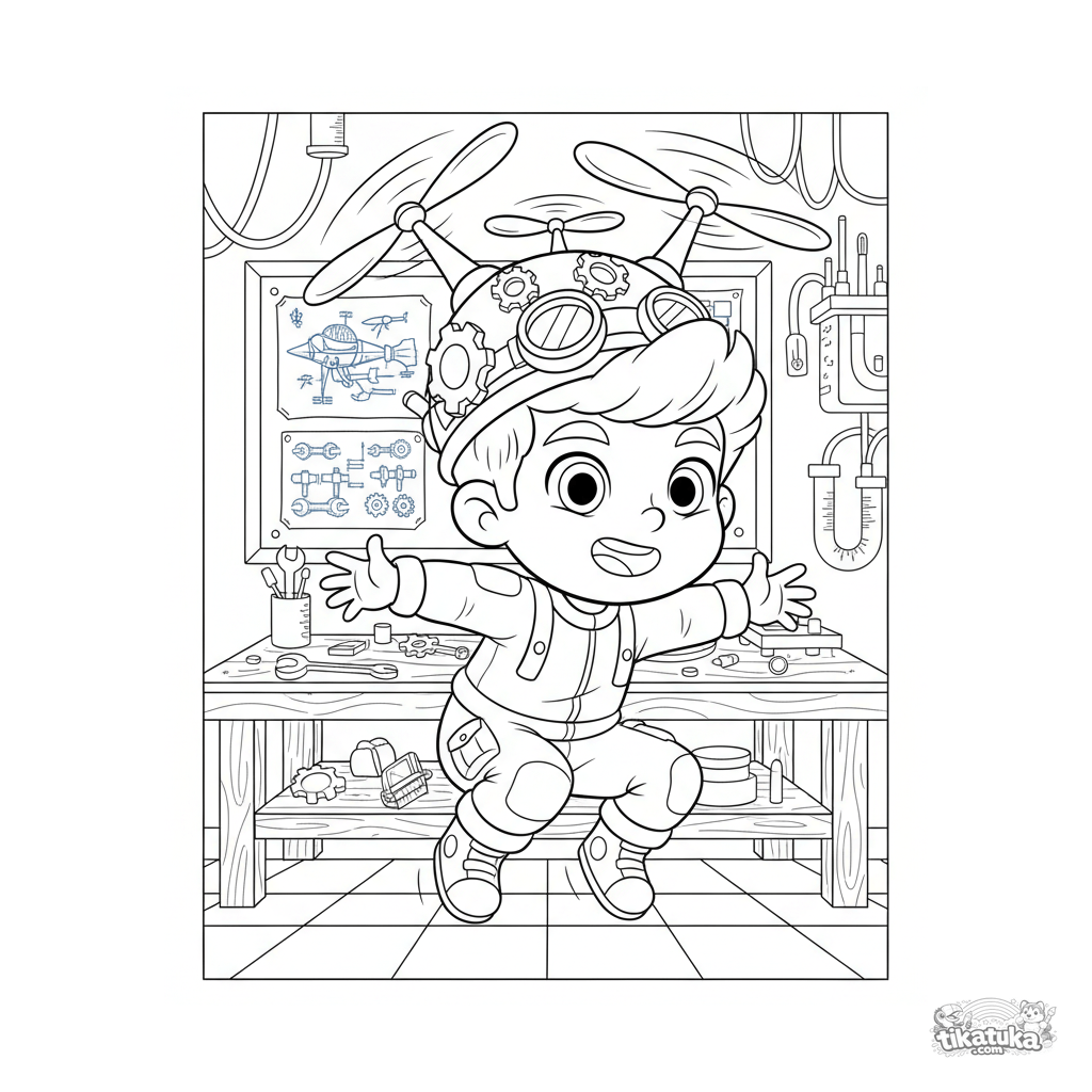 Página para colorir para 7-9 anos: um menino testa sua invenção, um chapéu com hélice que permite voar, em um laboratório secreto.