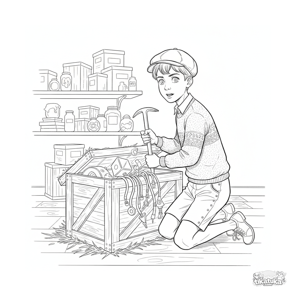 Página para colorir para crianças mais velhas 10-12: um assistente de inventor abre com cautela e curiosidade uma caixa de madeira misteriosa recém-entregue ao laboratório secreto.
