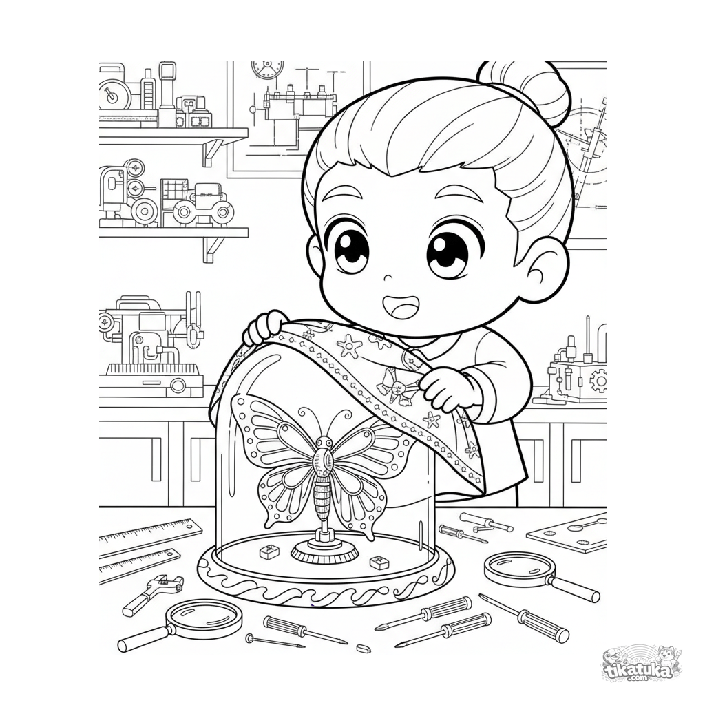 Página para colorir para crianças 7-9: um menino em um laboratório revela uma vitrine com uma delicada borboleta mecânica de corda.