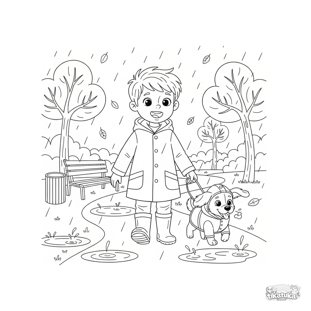 Página para colorir para crianças de 7-9 anos: um menino de capa de chuva passeia com seu cachorro no parque de outono na chuva. Detalhe moderado, poses expressivas.