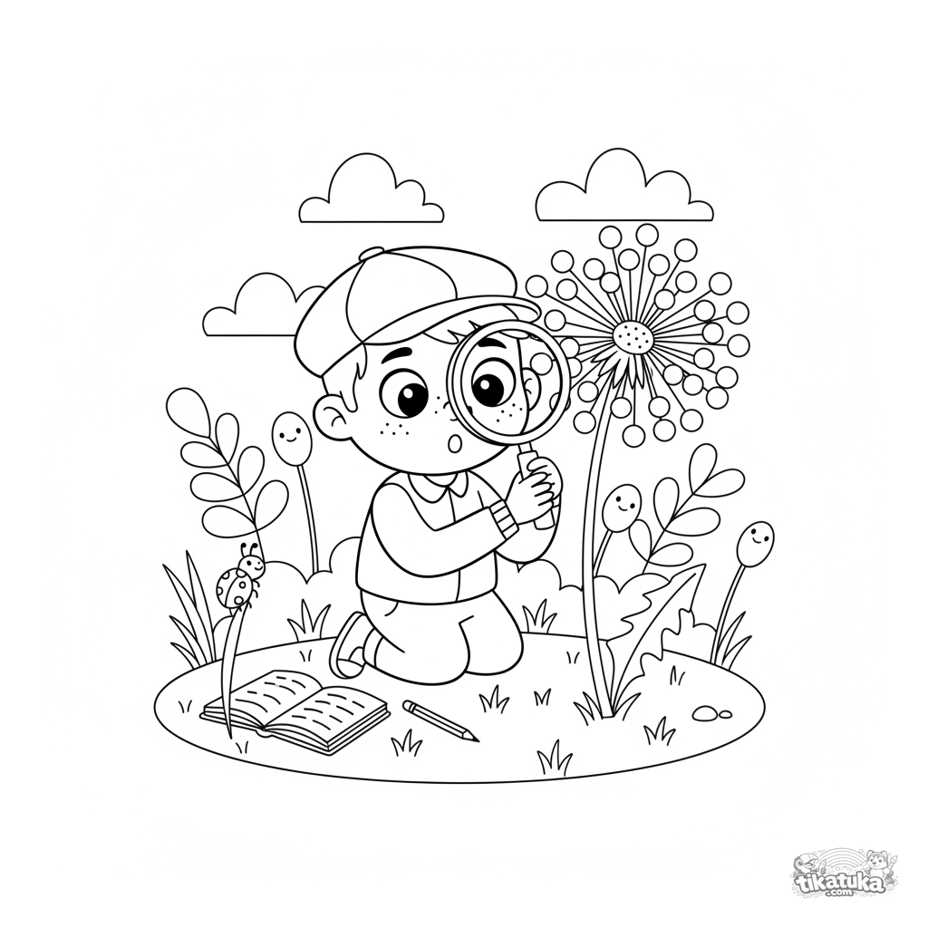 Página para colorir de um menino curioso usando uma lupa para examinar um grande dente-de-leão. Para crianças de 5 a 8 anos.