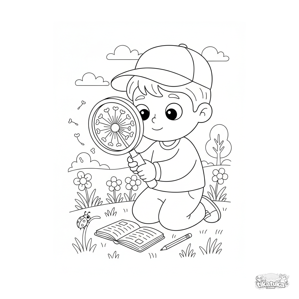 Página para colorir de um menino curioso inspecionando um dente-de-leão com uma lupa. Para crianças de 5-8 anos. A cena inclui um caderno e uma joaninha.