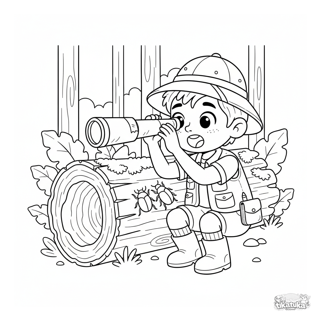Página para colorir para meninos de 4-6 anos: um jovem explorador de chapéu usa um periscópio caseiro para espiar dentro de um tronco oco gigante na floresta.