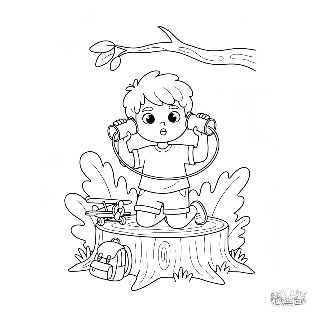 Página simples para colorir para crianças pequenas 2-3: um menino sentado em um toco falando em um walkie-talkie caseiro de lata. Formas grandes, margens amplas, detalhes mínimos.