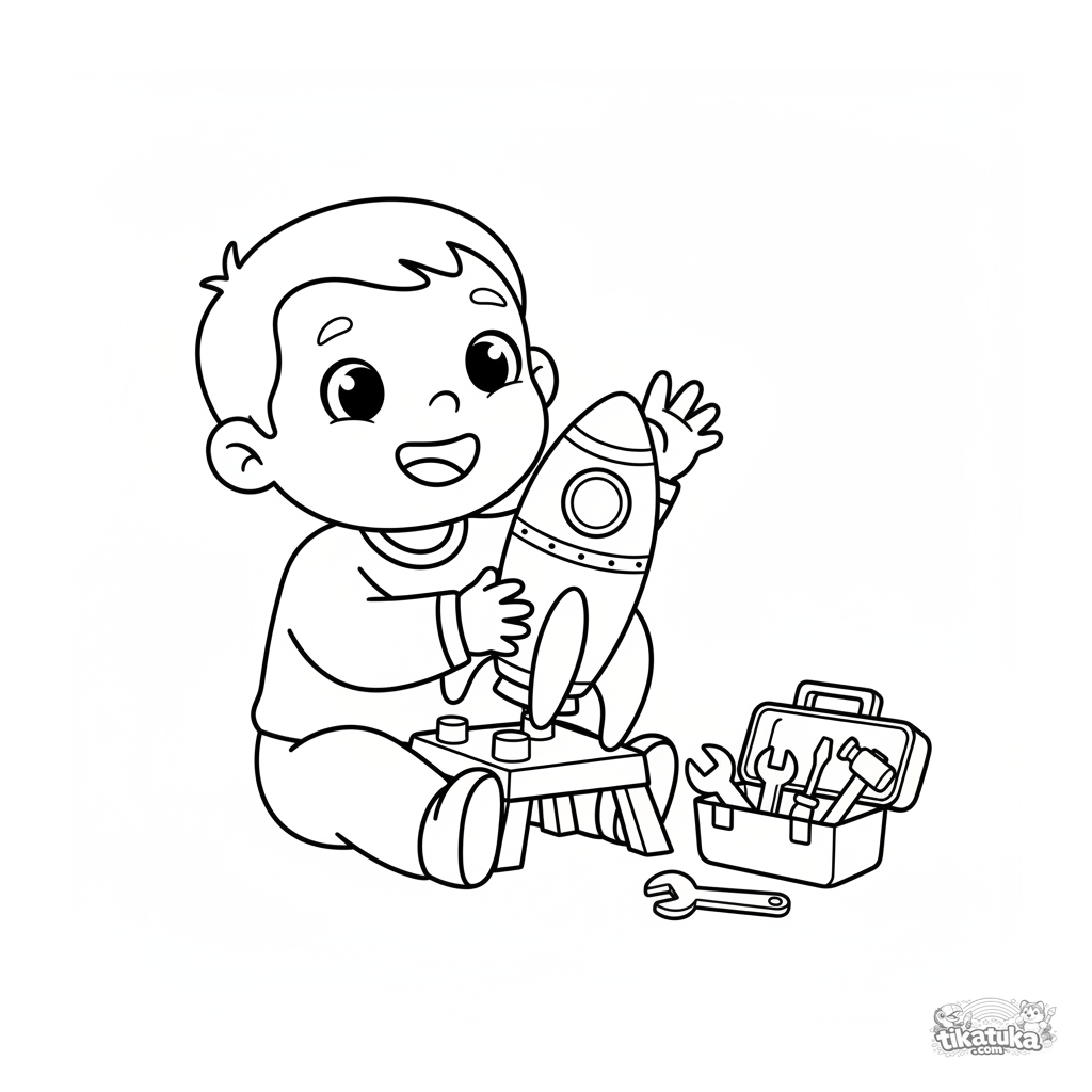 Página muito simples para colorir para crianças de 2-3 anos: um menino montando um foguete de brinquedo em uma plataforma de lançamento.