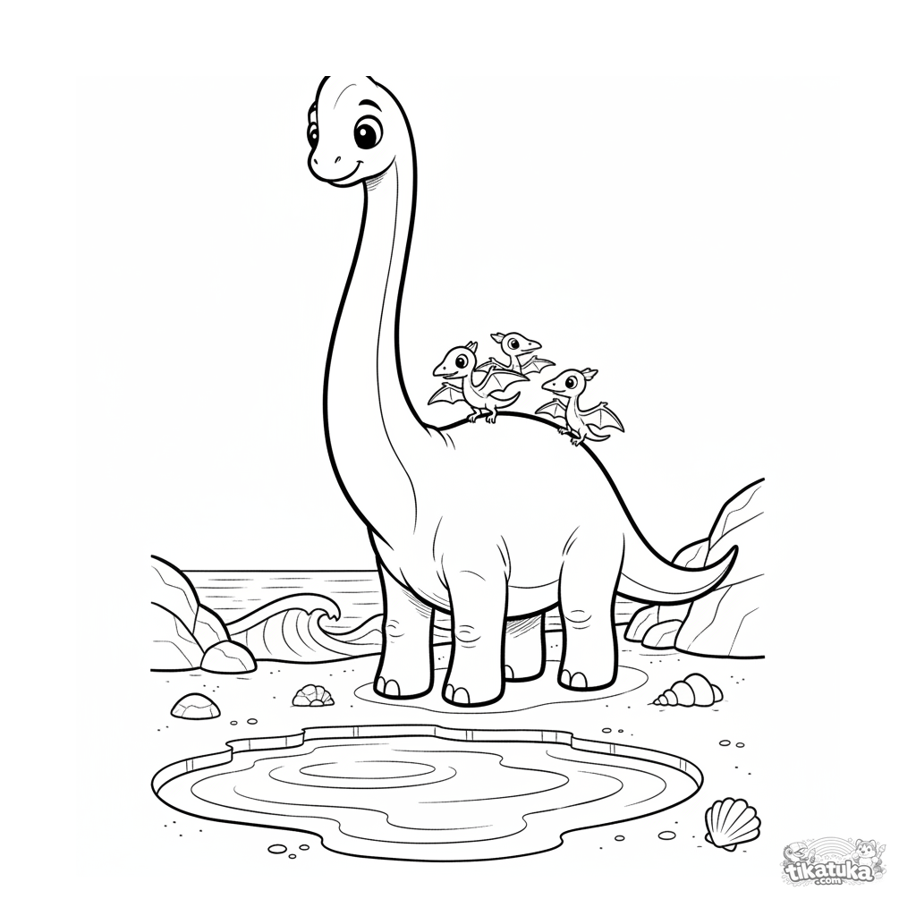 Página para colorir para crianças de 7-9 anos em estilo esboço aquarela: um majestoso brachiosaurus bebe água de uma poça de maré em uma praia de areia antiga. Cena calma e graciosa.