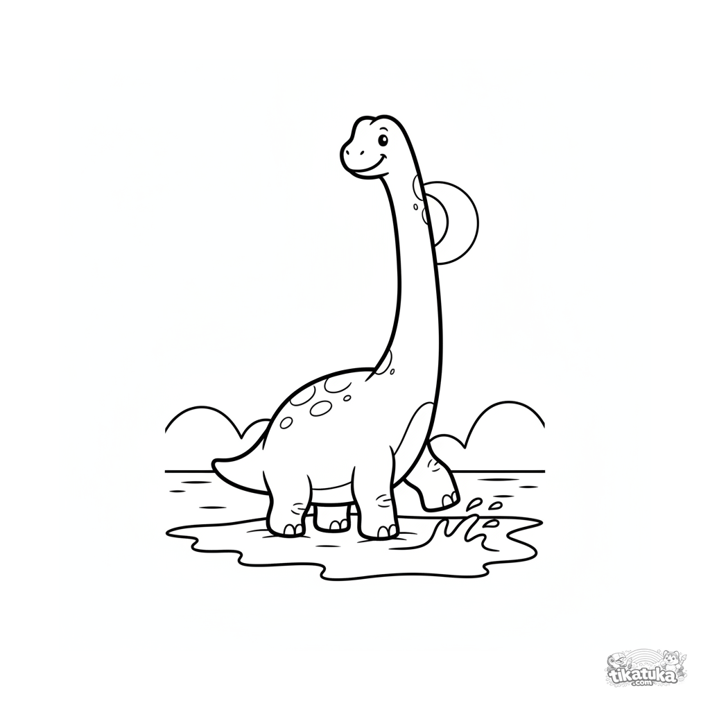 Página para colorir simples para crianças pequenas 2-3: um gigante brachiossauro espirra feliz na suave arrebentação de uma praia oceânica antiga. Formas simples enormes, margens amplas.
