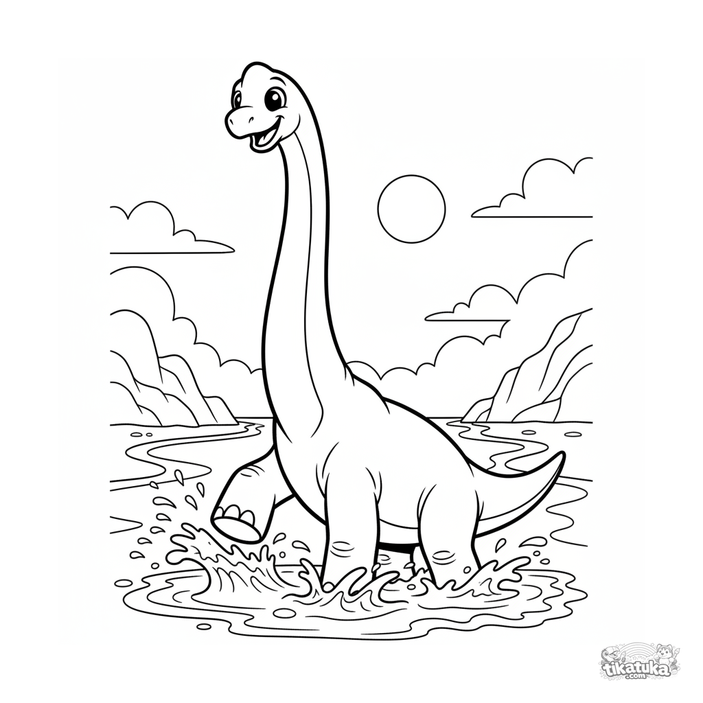 Página para colorir para crianças de 7-9 anos no estilo anos 90: um braquiossauro brincando nas ondas rasas de um oceano antigo.