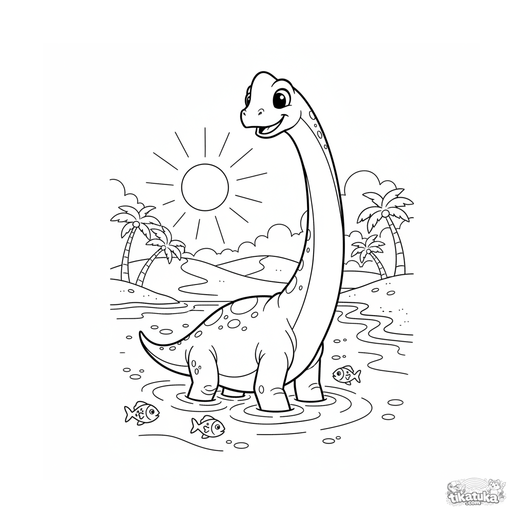 Página para colorir para crianças 7-9 em estilo clássico: um majestoso brachiossauro vadeia nas águas rasas de um oceano antigo. Linhas fluidas, cena épica.