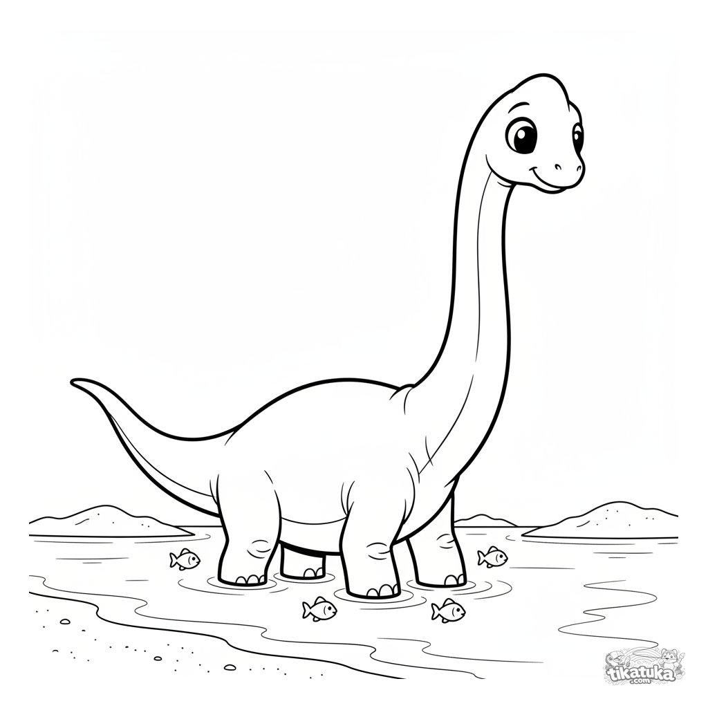 Página para colorir para 7-9 anos: um gigantesco braquiossauro vadeia lentamente pelas águas rasas de um oceano antigo perto de uma praia de areia. Pequenos peixes nadam ao redor, cena em estilo esboço.