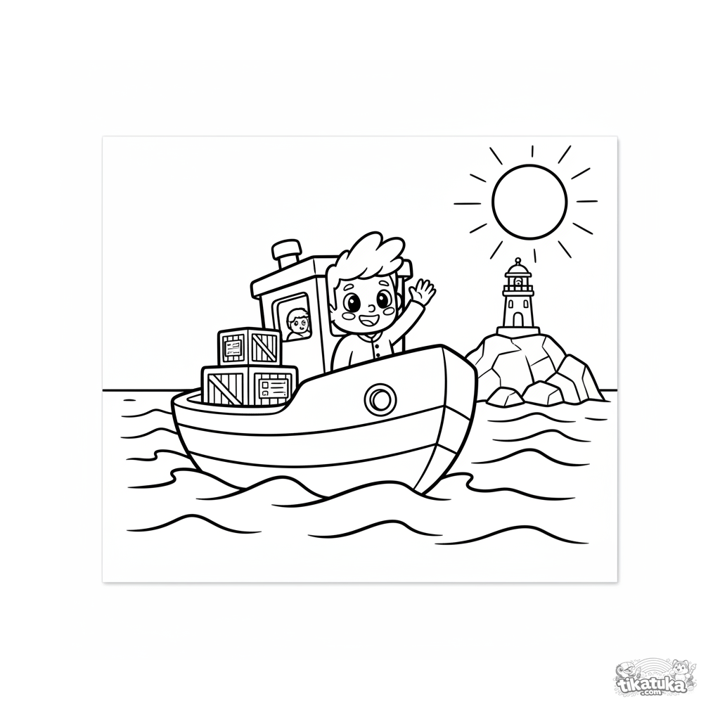 Página para colorir para crianças de 4-6 anos: um barco de serviço listrado em vermelho e branco leva suprimentos para uma ilha com farol.