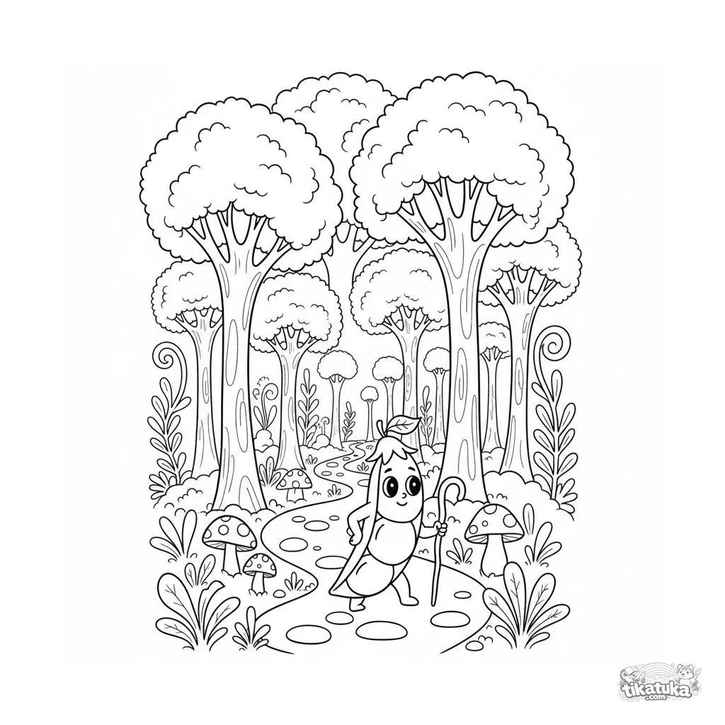 Página para colorir de fantasia: uma floresta de brócolis e um explorador de vagem. Para crianças de 7-9 anos. Cena fantástica.