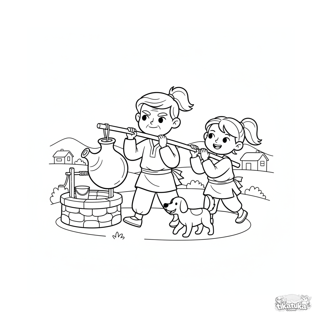 Página para colorir para pré-adolescentes 7-9: um irmão e uma irmã carregam um grande jarro de água viva do poço. História calorosa sobre ajudar, dois personagens.