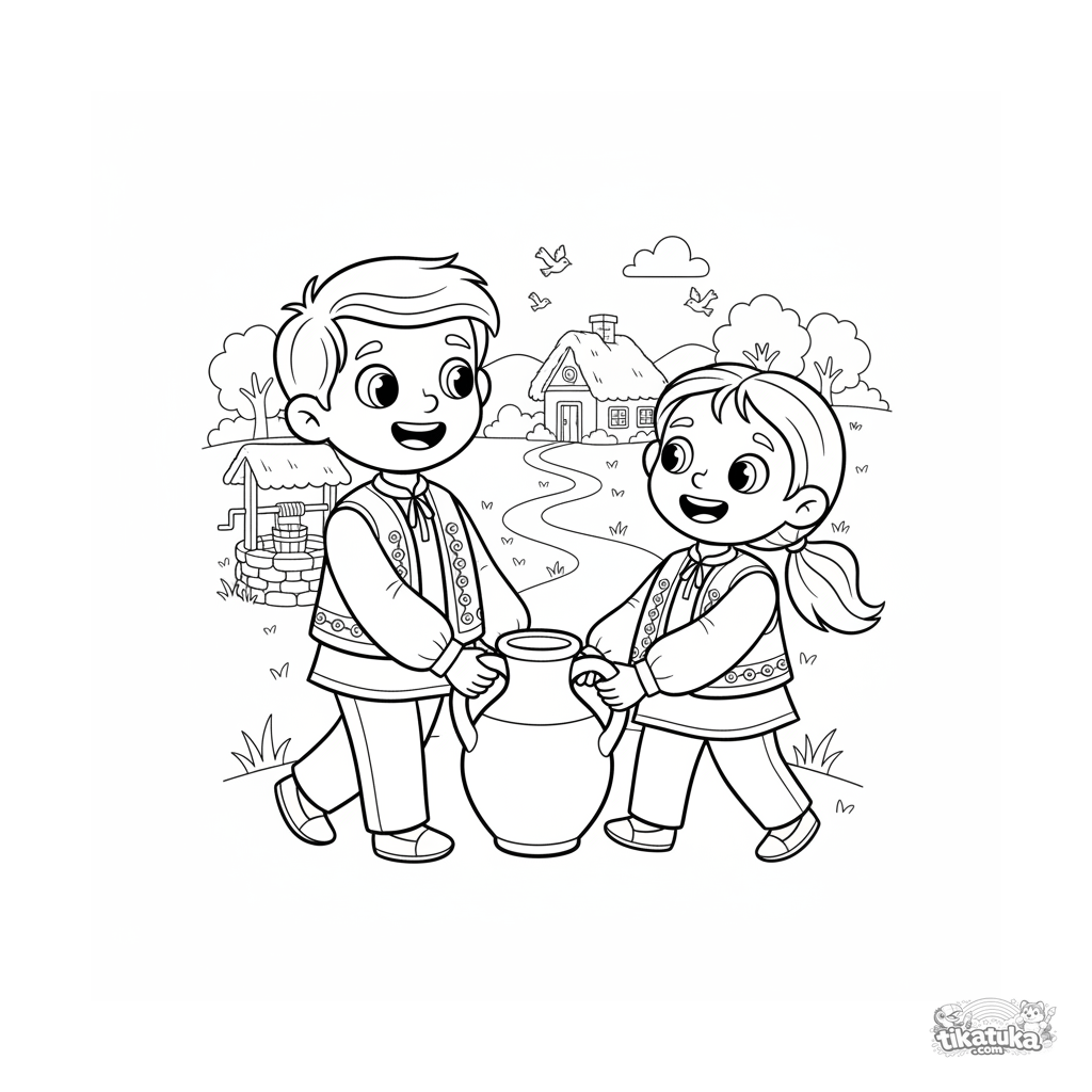 Página para colorir para crianças 7-9: um irmão e uma irmã em coletes típicos carregam uma jarra de água do poço. Cena sobre cooperação e vida na aldeia.