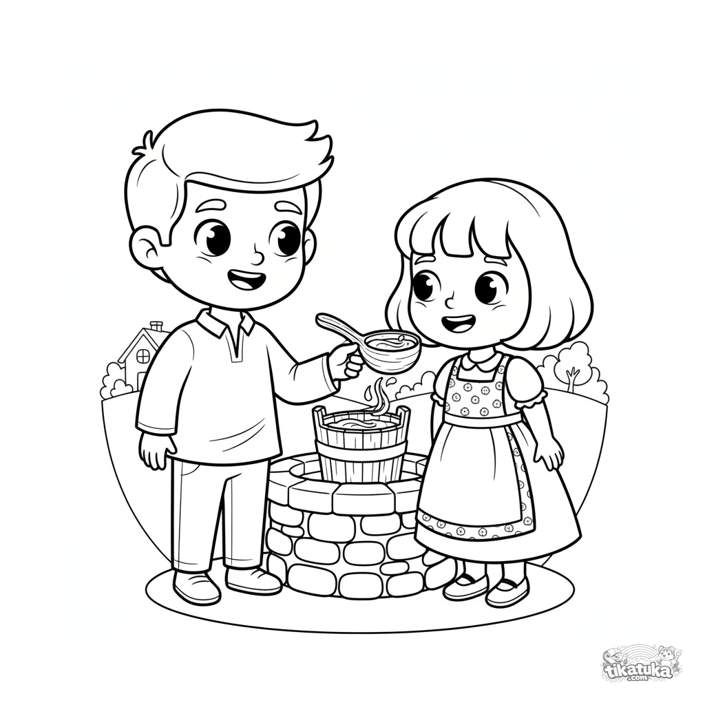 Página para colorir para crianças 7-9: um irmão e uma irmã com trajes tradicionais bebem água do poço mágico. Cena calorosa sobre ajuda e família em estilo folclórico.