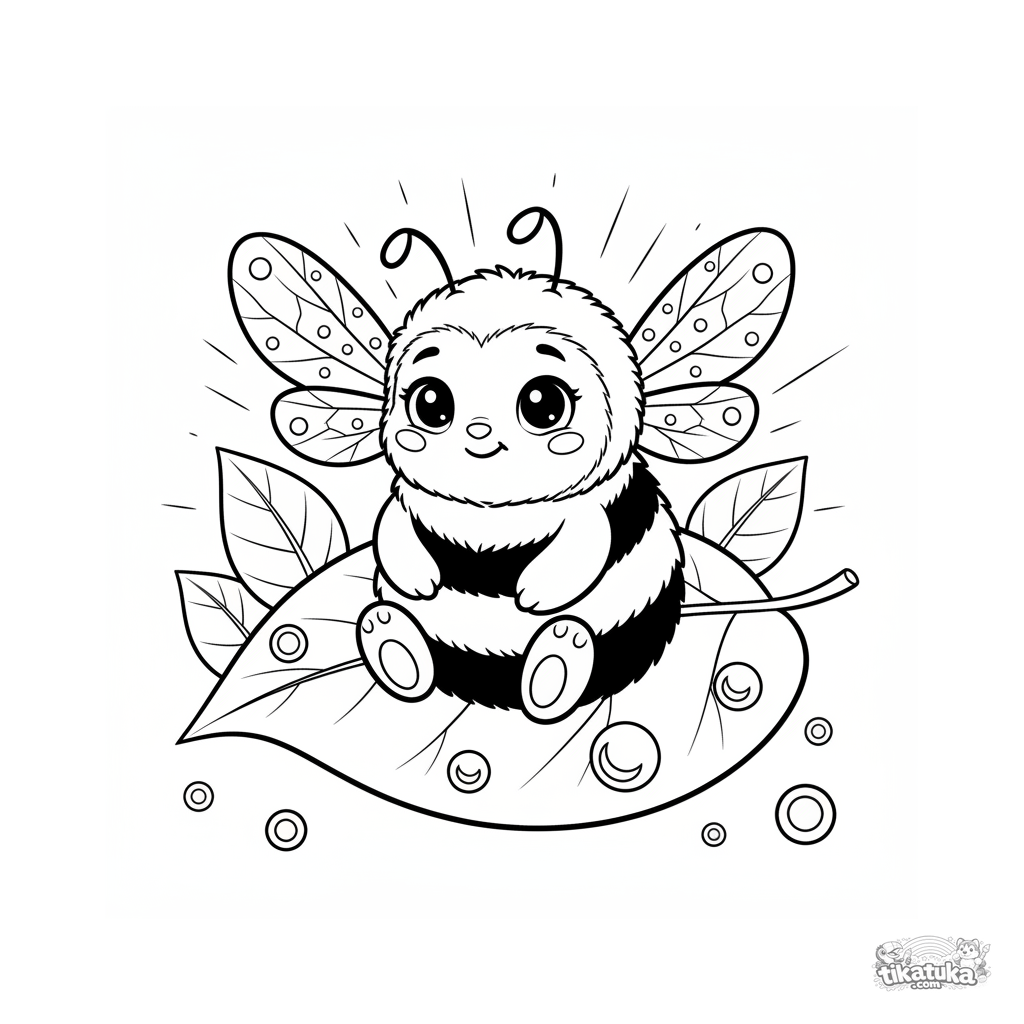 Página para colorir para 7-9 anos: uma abelha mamangá fofa seca suas asas em uma folha grande após um banho de orvalho. Cena fofa e tranquila com detalhes moderados.