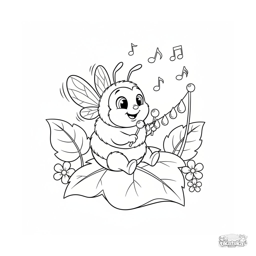 Página para colorir para crianças 4-6: uma abelha toca um xilofone de orvalho em uma folha grande. Cena musical divertida.