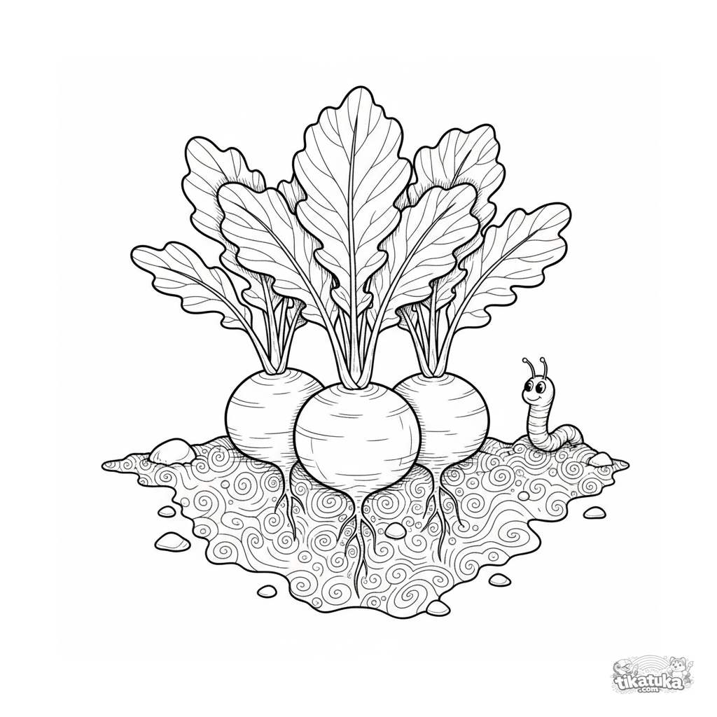 Página para colorir detalhada de rabanetes crescendo no solo, com minhoca. Para 10-12 anos. Cena de jardim naturalista.