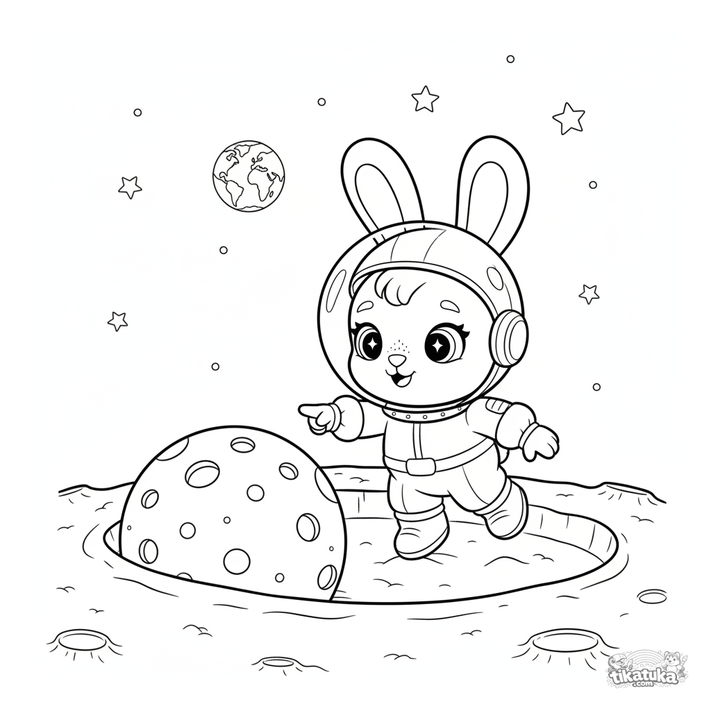Página para colorir para crianças 4-6: Coelho padeiro em traje espacial explorando a superfície da lua. Estilo de boneco de pano, estrelas e crateras simples, margens largas.
