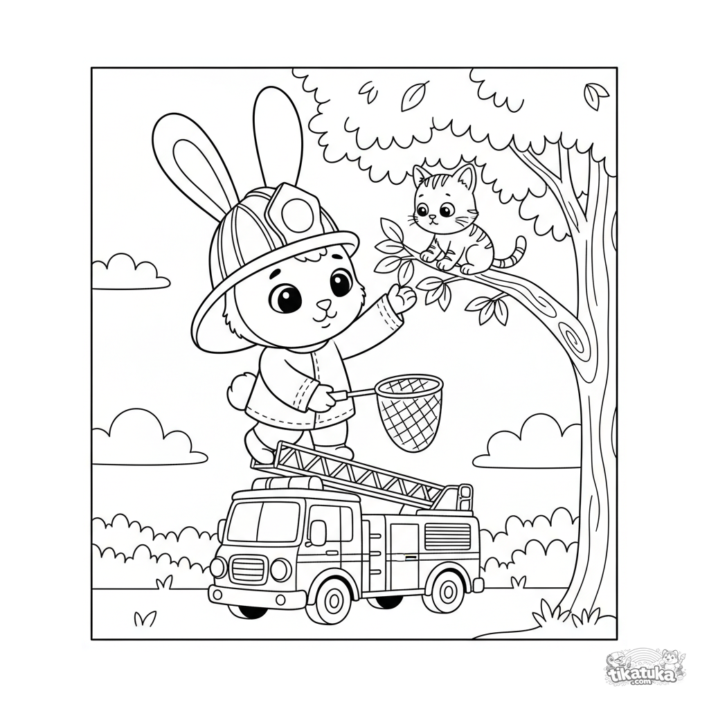 Página para colorir para crianças 4-6: coelho bombeiro resgatando um gatinho de uma árvore. Cena de ajuda gentil no estilo de marionete macia.