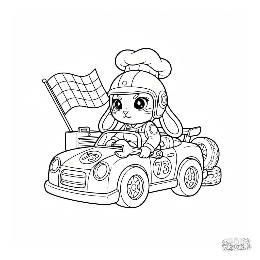 Página para colorir para meninos 4-6: coelho padeiro com capacete trabalha como mecânico em um pit stop, apertando uma roda de um carro de corrida. Estilo geométrico de brinquedo de madeira.