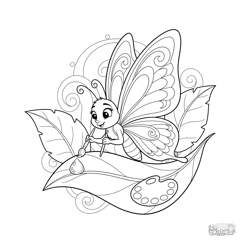 Página para colorir para 7-9 anos: uma borboleta artista pintando em uma tela de orvalho em uma folha grande. Cena criativa e artística.