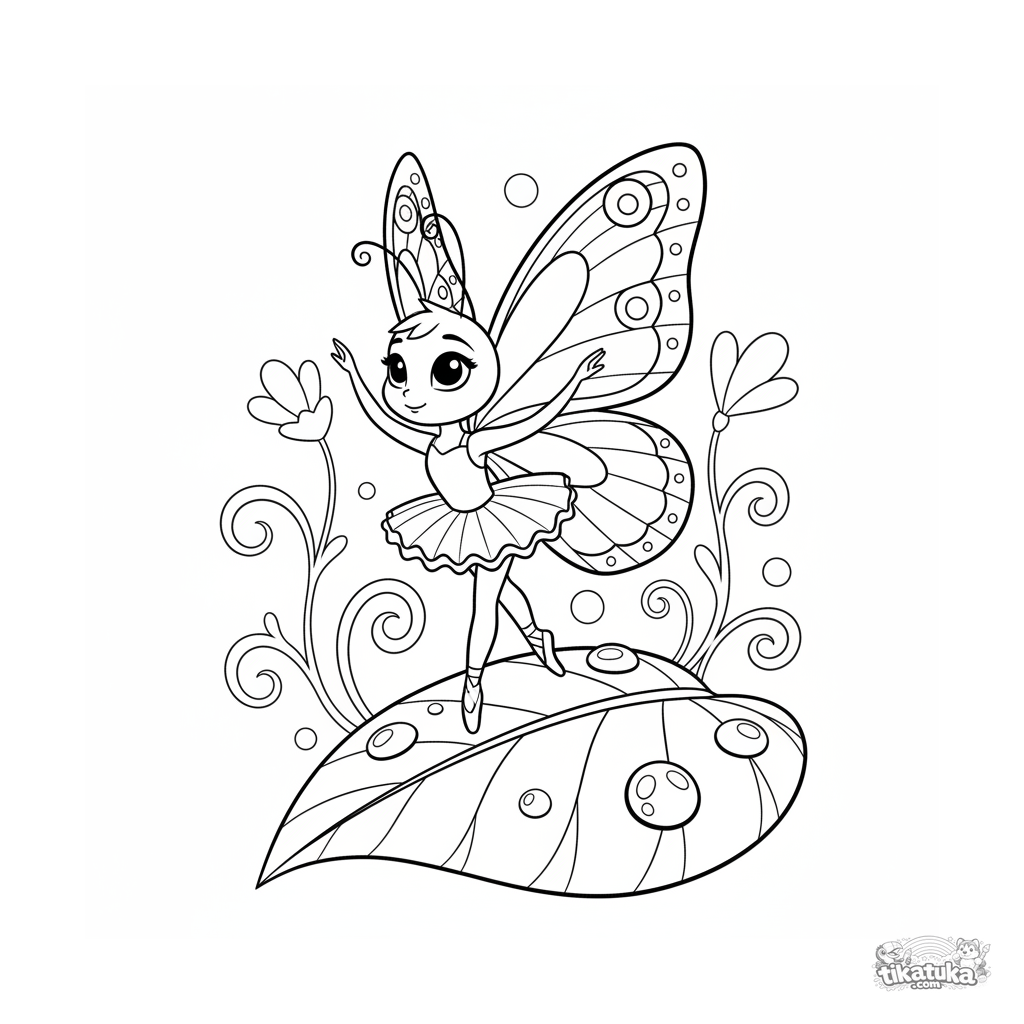 Página para colorir para 7-9 anos: uma borboleta bailarina pratica sua dança na ponta de uma folha grande com orvalho. Estilo Art Nouveau.