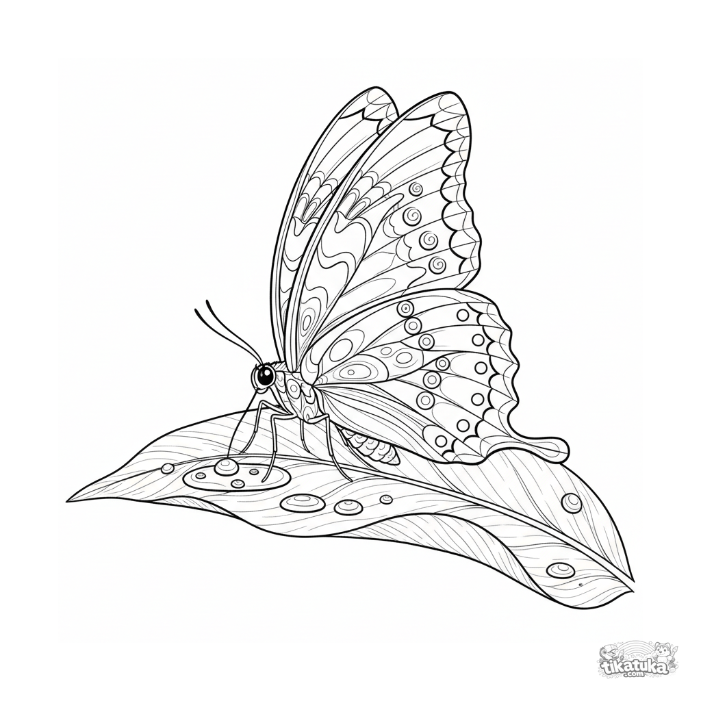 Página para colorir para 7-9 anos: uma borboleta com asas padronizadas bebe água de uma poça de orvalho em uma folha. Ilustração realista de inseto.