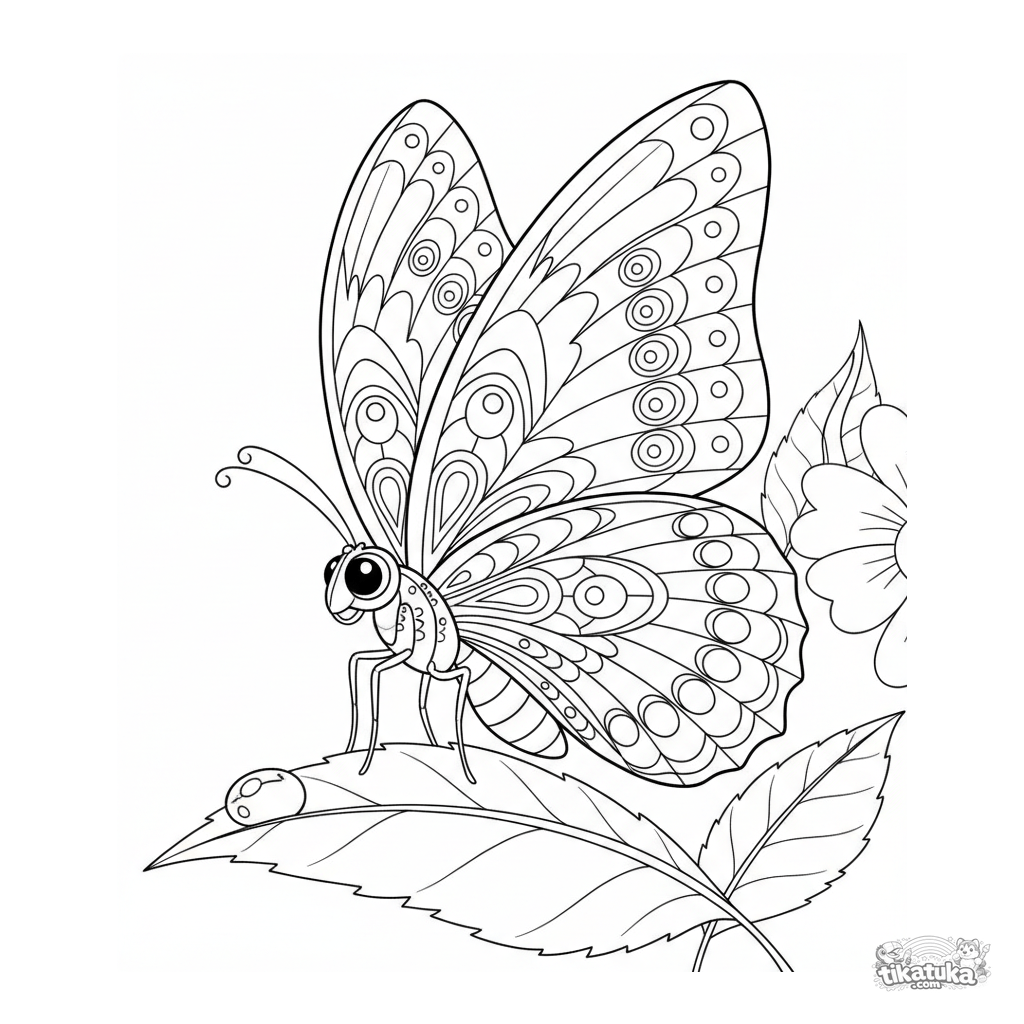 Página para colorir para crianças 7-9: uma borboleta realista com asas padronizadas bebe de uma gota de orvalho na borda da folha. Detalhe moderado e precisão anatômica.