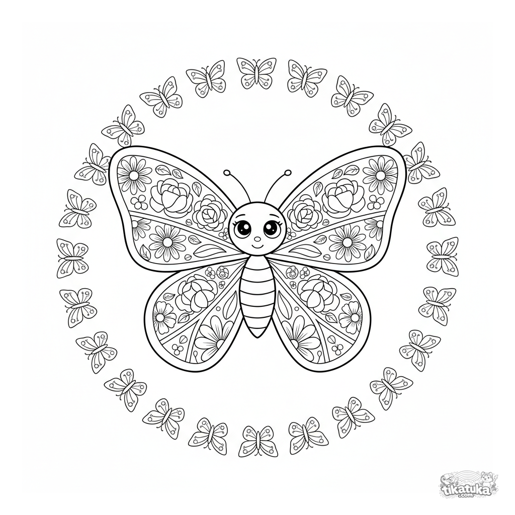 Página para colorir de mandala em forma de borboleta detalhada para 10-12 anos. As asas são preenchidas com diferentes padrões florais, cercadas por um anel de folhas e borboletas pequenas.