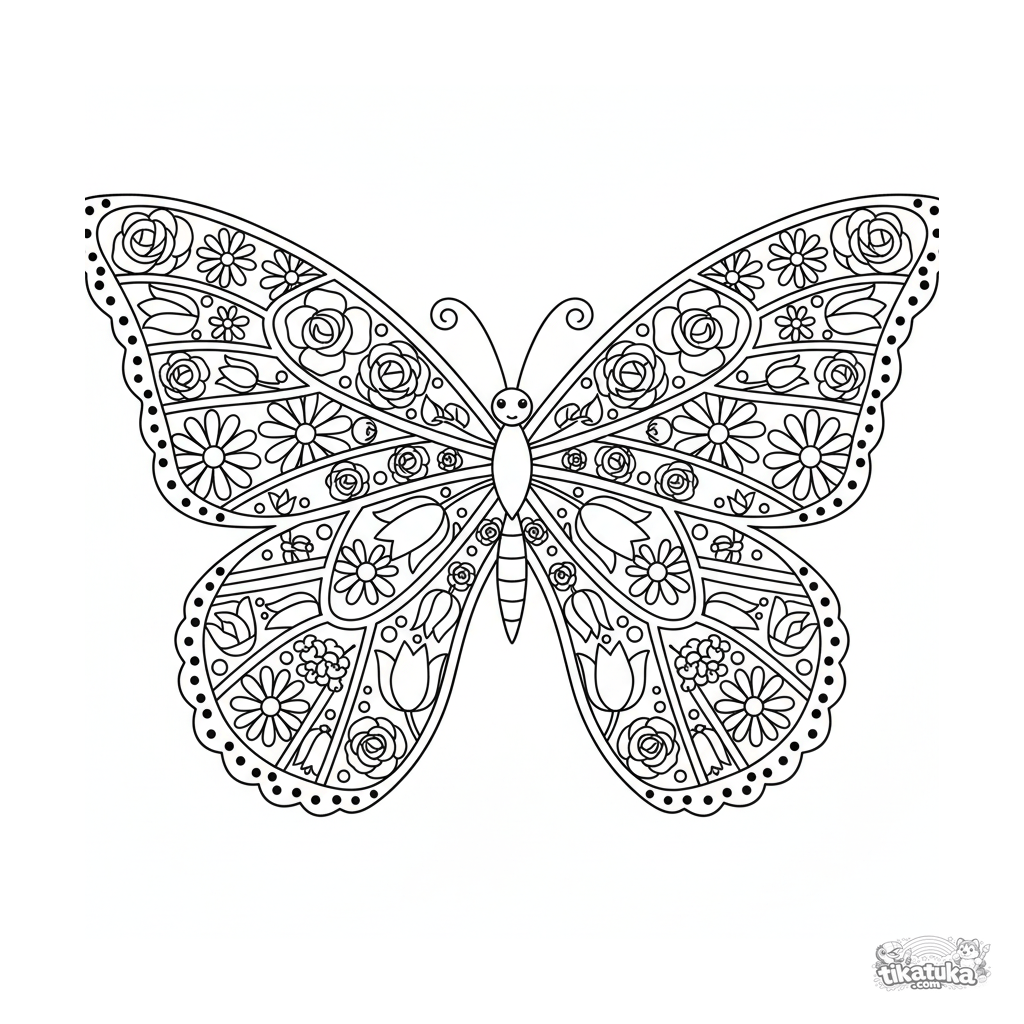 Página para colorir mandala de asa de borboleta detalhada para 10-12 anos. Corpo central, asas espelhadas divididas em compartimentos com diferentes padrões florais. Design complexo e simétrico para amantes da natureza.