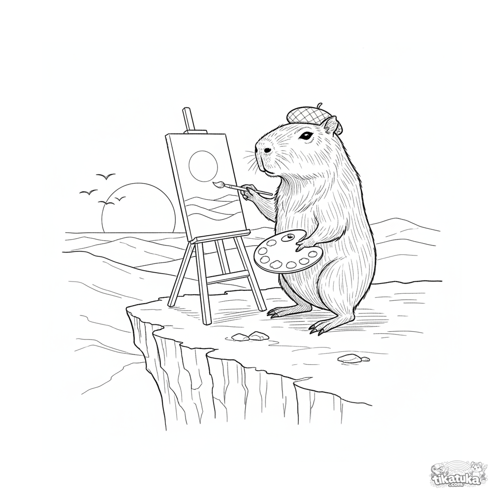 Página para colorir detalhada para crianças de 10 a 12 anos: uma capivara artista pintando o pôr do sol em um cavalete à beira de um penhasco. Estilo esboço-aquarela.