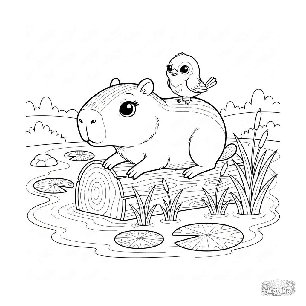 Página para colorir detalhada para 10-12 anos: uma capivara e um pássaro aproveitam o pôr do sol em uma lagoa. Cena de amizade e calma.