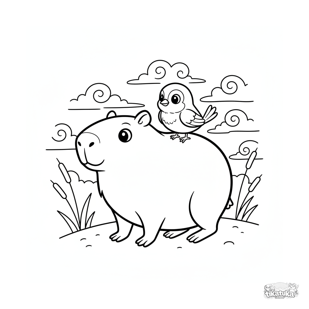 Uma página para colorir de Capivaras e relax com nível Médio. Ela combina com a idade 4-6 anos, imprime bem em casa e abre imediatamente no modo online.