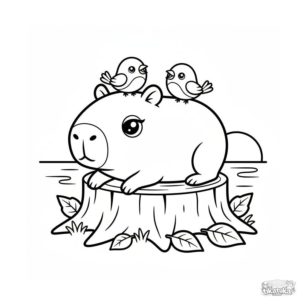 Uma página para colorir de Capivaras e relax com nível Fácil. Ela combina com a idade 2-3 anos, imprime bem em casa e abre imediatamente no modo online.