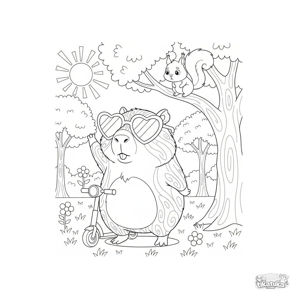 Página para colorir para crianças de 7 a 12 anos: uma capivara superconfiante de óculos escuros comemora ao lado de um patinete minúsculo em um parque. Cena absurda e engraçada.