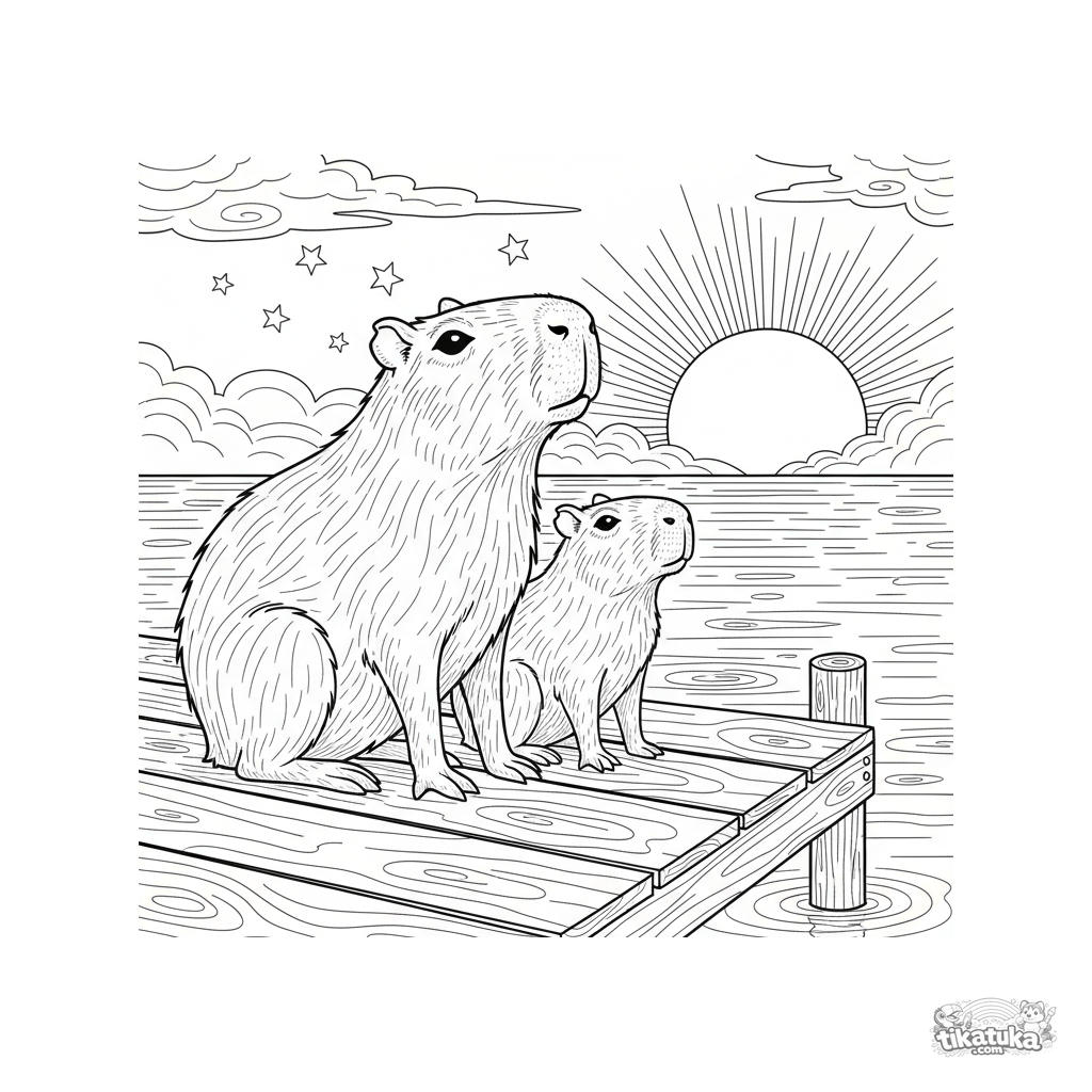 Página detalhada para colorir para crianças de 10-12 anos: duas capivaras em pose calma observam estrelas no pôr do sol de um cais de madeira. Cena de amizade e tranquilidade.